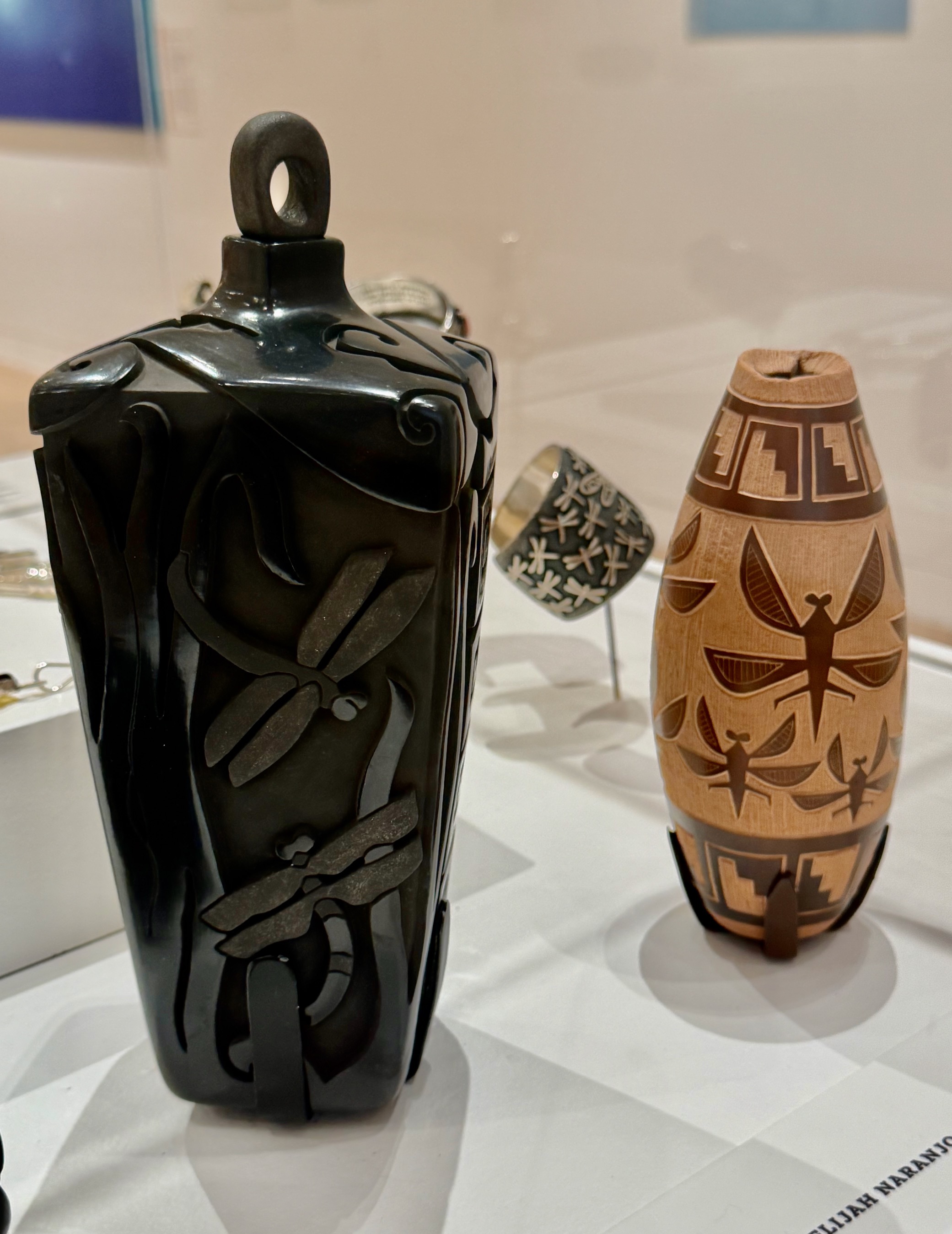 Art featuring creatures of healthy air: 2001 Dragonfly Tall Lidded Jar by Autumn Borts (Santa Clara Pueblo), 2005 Dragonfly Bracelet by Ramon Dalangyawma (Hopi), and 2006 Dragonfly Vase by Dolly Naranjo Neikrug (Santa Clara Pueblo).