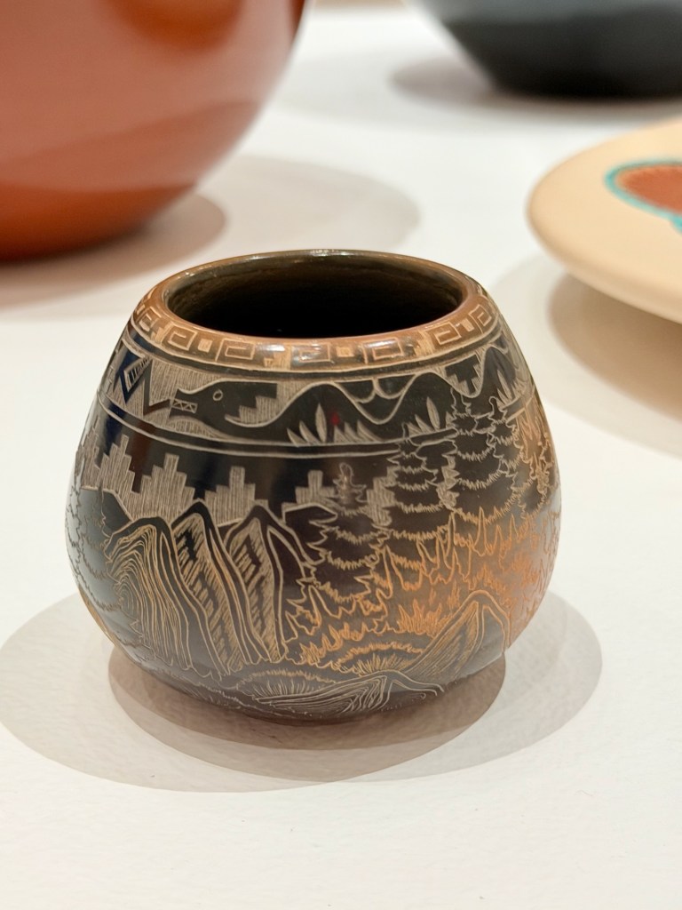2011 Las Conchas Fire by Kevin Naranjo (Santa Clara Pueblo) – a carved (sgraffito) ceramic depcting trees, land, and fire that burned 150,000 acres of Santa Clara’s land on the Pajarito Plateau, including ancestral sites; the Avanyu water spirit hovers above.