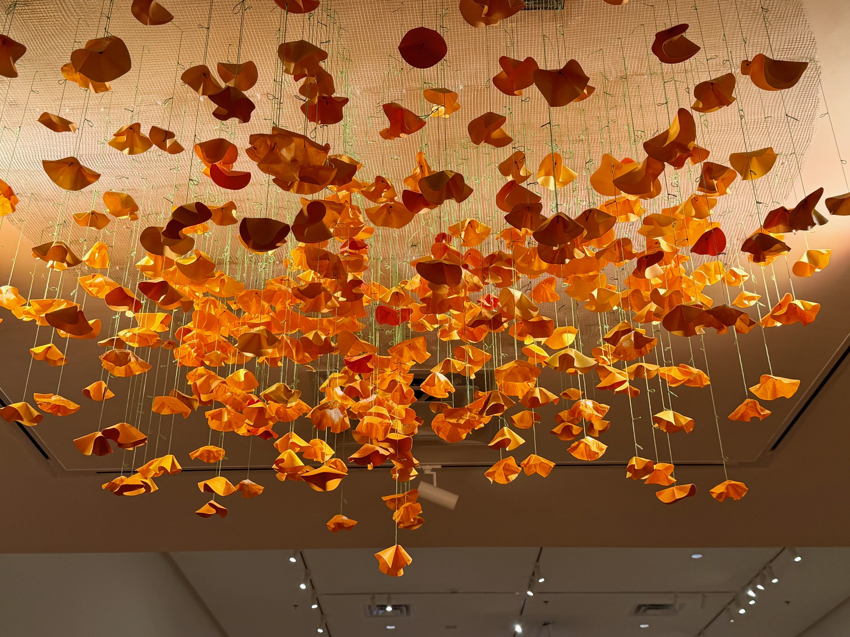 2025 dyed handmade paper installation The Sun is on the Ground by Leah Mata Fragua (Northern Chumash), suggesting the wild poppies that bloom right after a wild fire. Installation intended to be recycled with fire at the exhibition’s conclusion. Courtesy: the artist