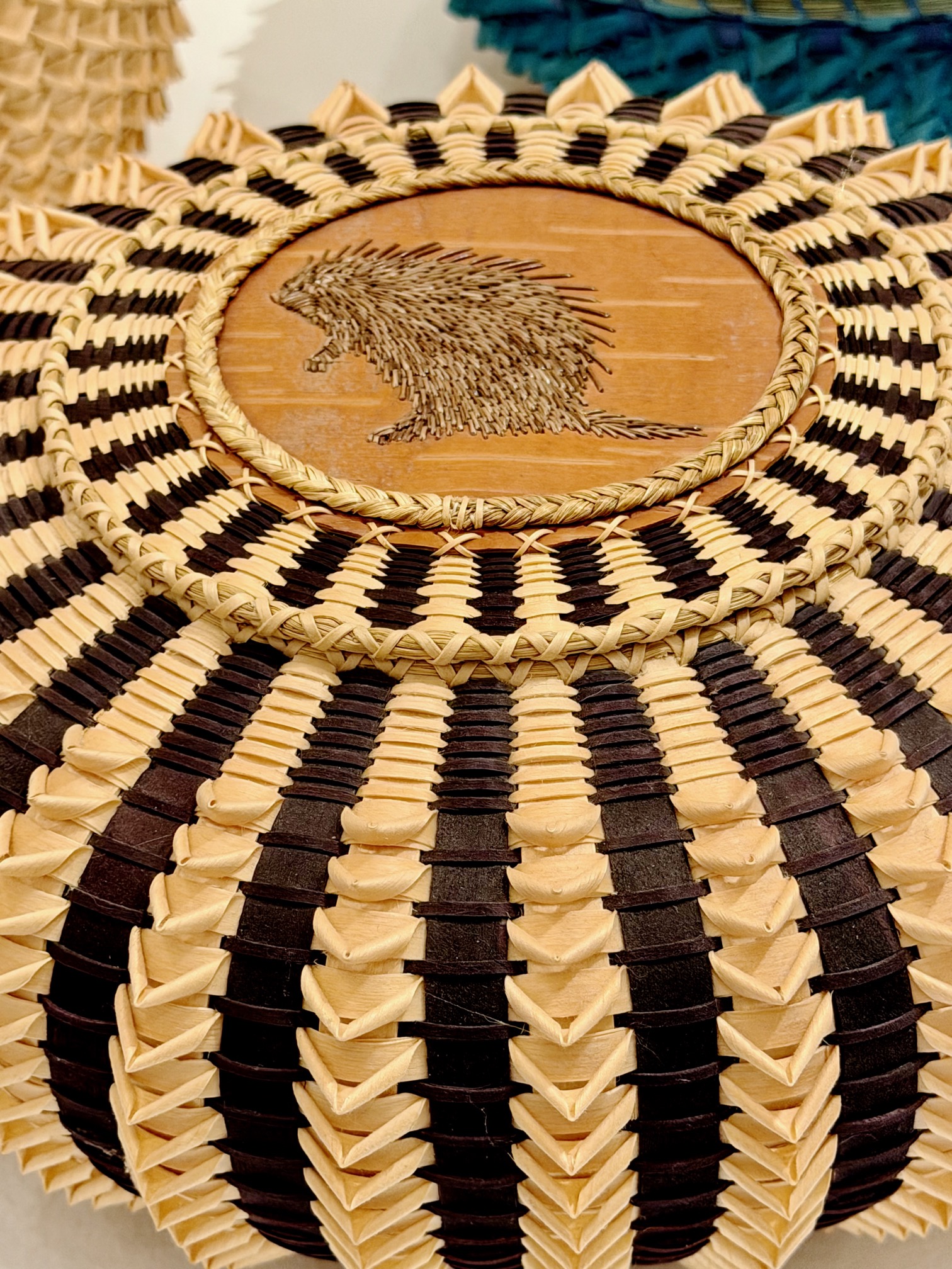 Closeup of 2010 Lidded Basket with Porcupine Design by Jeremy Frey (Passamaquoddy) woven from black ash, sweetgrass, and porcupine quills; 2010 SWIA Market award winner. Courtesy: private collection.