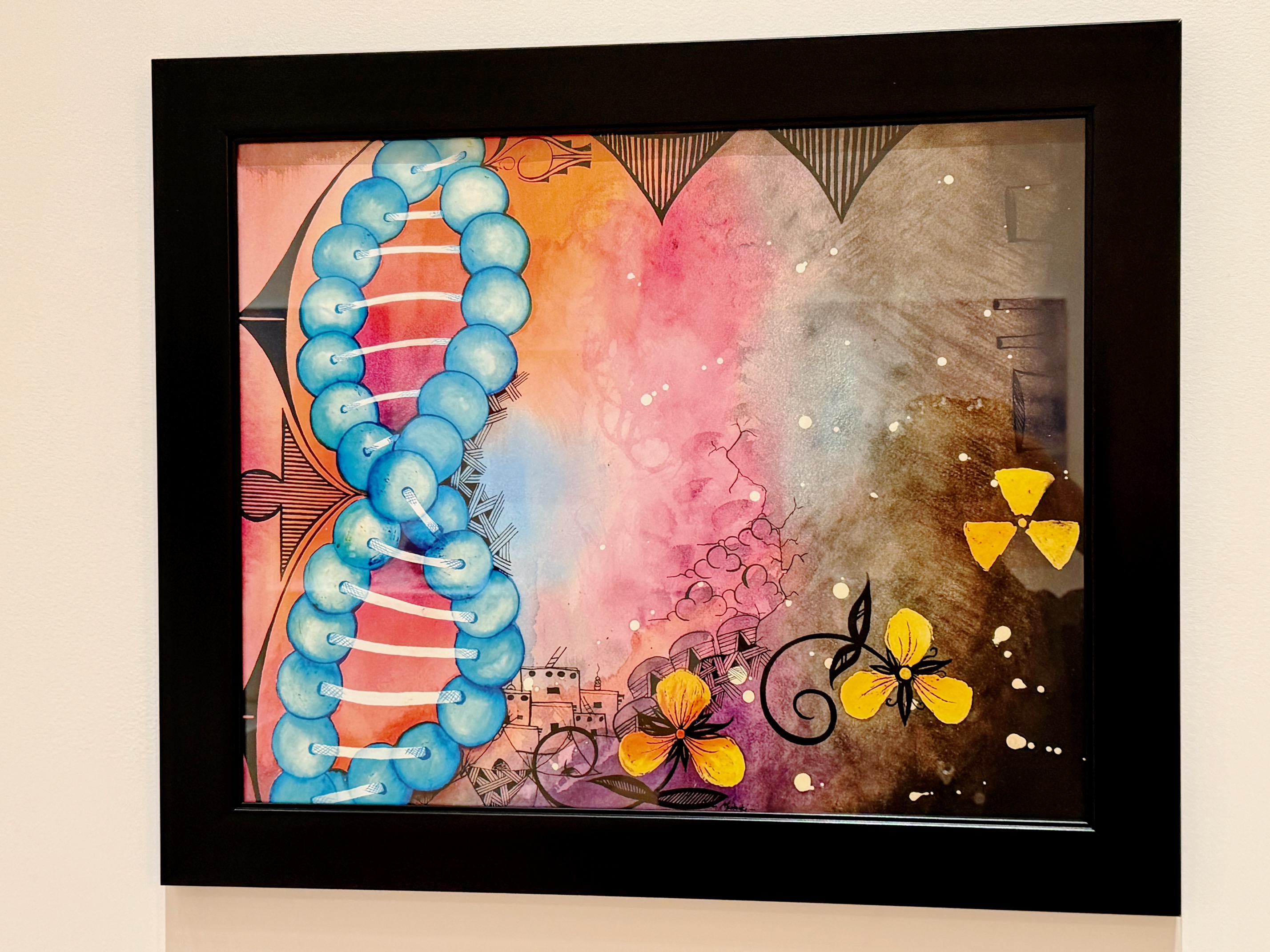2019 We Will Continue to Fight by biologist-artist Mallery Quetawki (Zuni Pueblo), raising awareness of how radiation contamination on native land damages people’s DNA. Courtesy: the artist, University of New Mexico Community Environmental Health Program