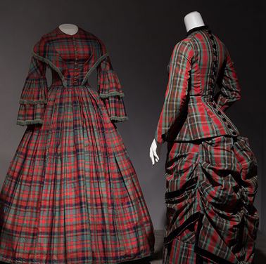 19th century passion for plaid in silk dress (1852) and wool bustle dress.