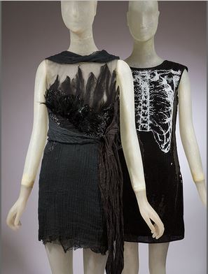 Rodarte’s California condor-inspired evening dress (2010) (left) next to their chest X-ray dress for Target (2011) (right)