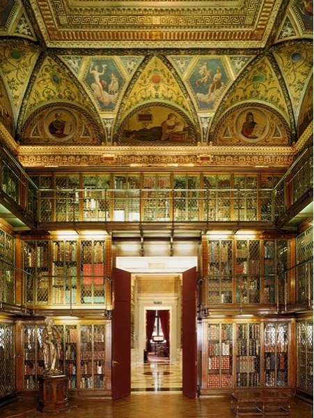 30-foot walls of Mr. Morgan’s Library have three stories of inlaid Circassian walnut bookcases with treasures of world literature. Photo © 2006 Todd Eberle