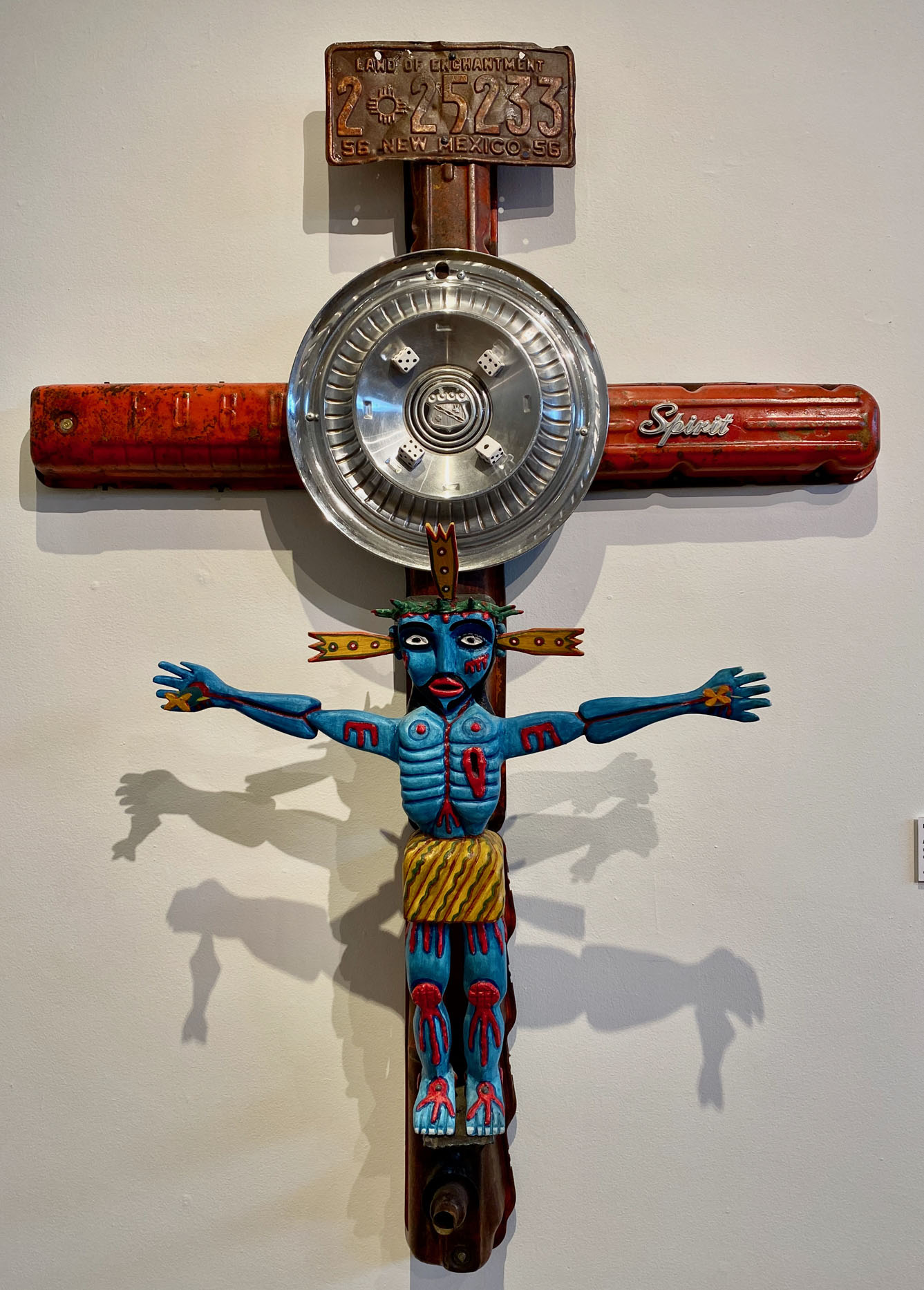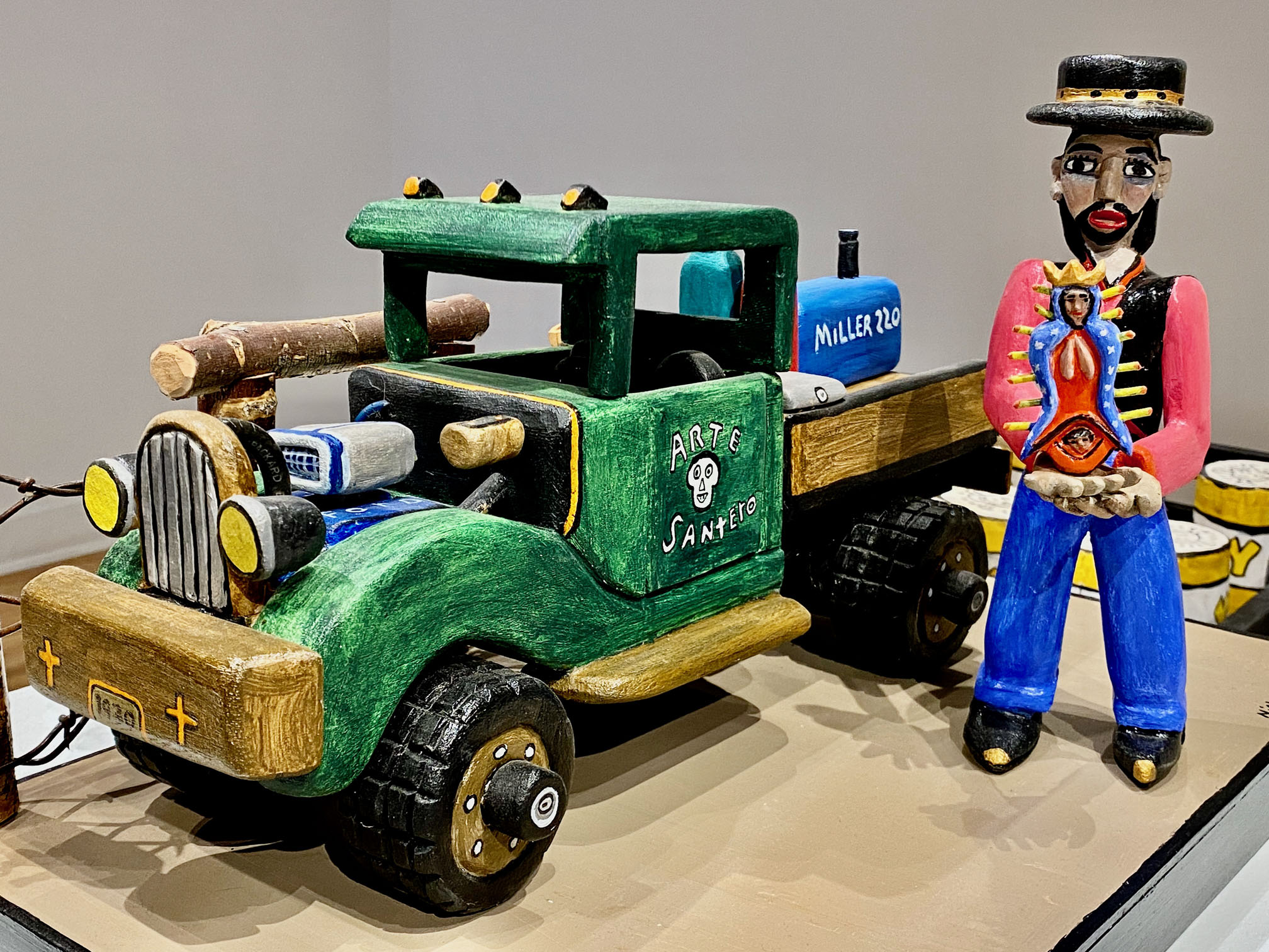 Nicholas Herrera: El Rito Santero, on view at the Harwood Museum of Art through June 1, fills three galleries with work by a New Mexican wood carver who not only pays tribute to saints and ceremonies important to the nearby rural Hispanic communities, but also channels politics, social commentary, lowrider culture, and pressures of modern life in a mixed-up world into his craft.