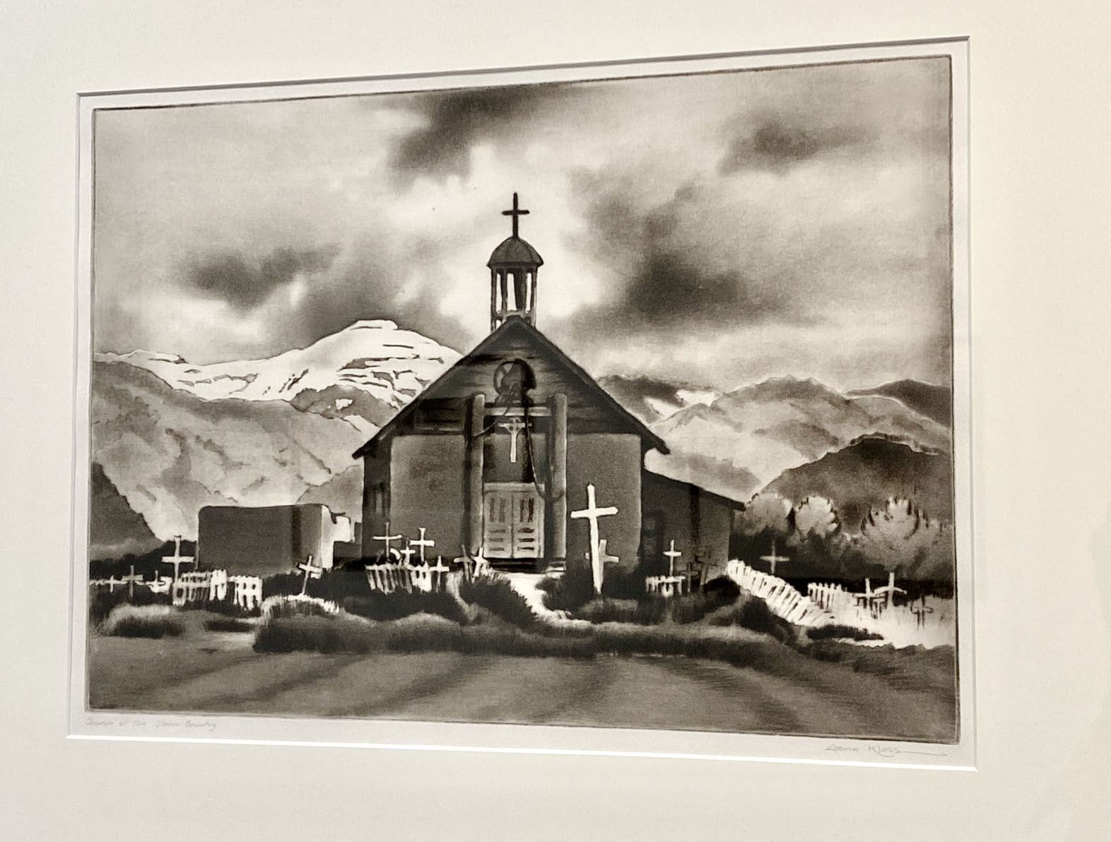 Kloss 1941 drypoint Church of the Storm Country. Courtesy: Taos Municipal Schools.