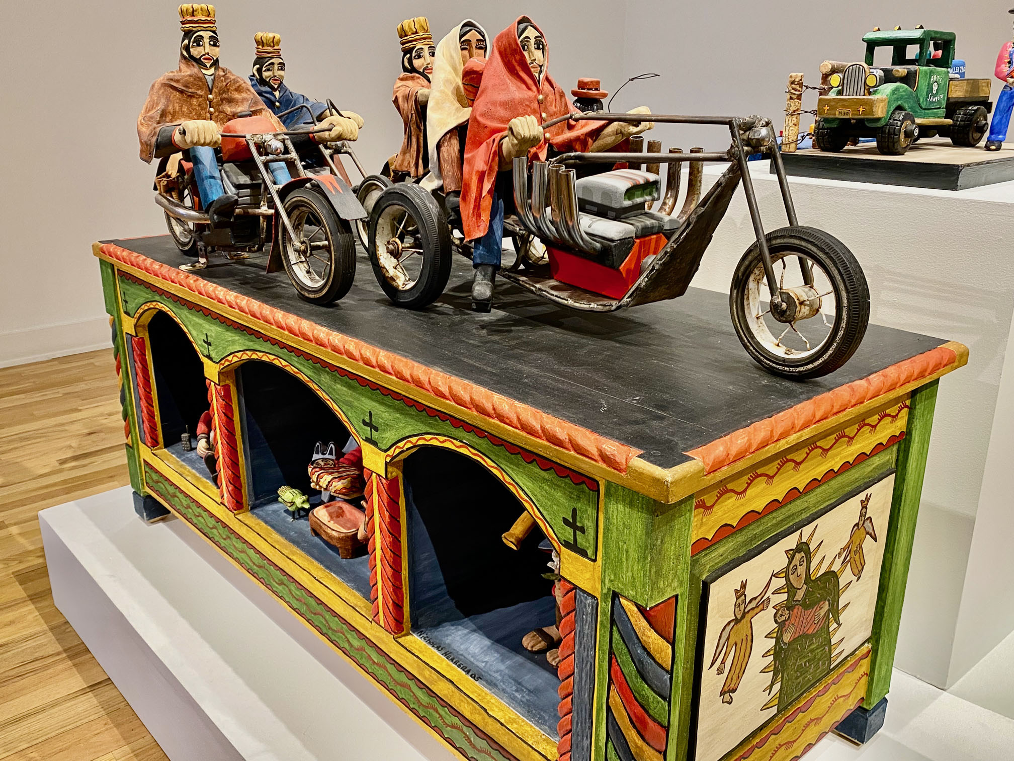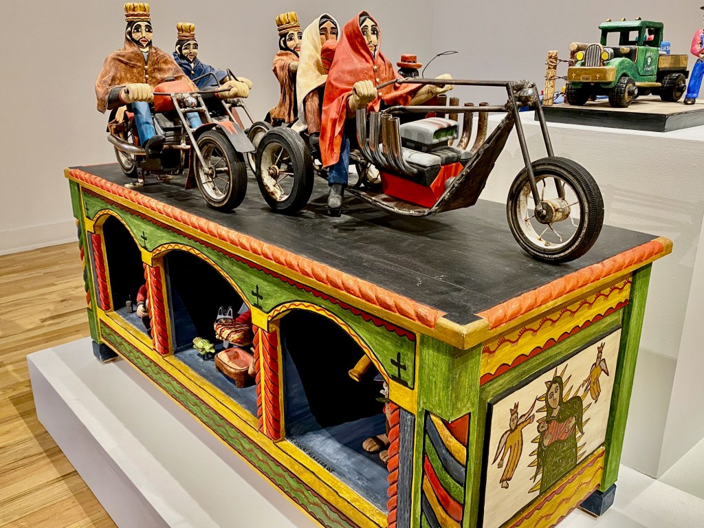 The Holy Family hits the road in Herrera’s 2005 carved and painted Low Rider Nativity, embellished with cloth, toy wheels, and found metal. Courtesy: private collection