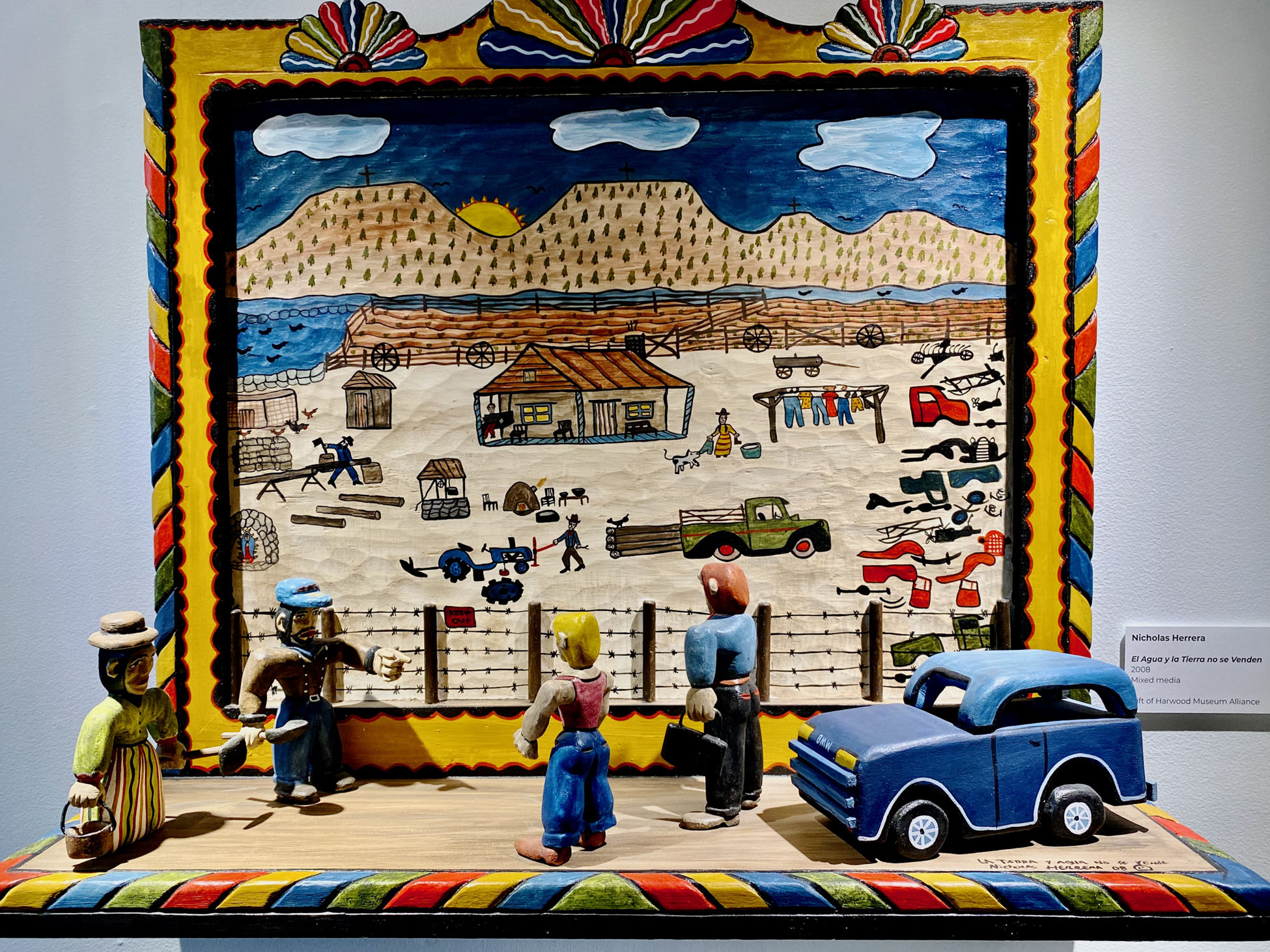 Herrera’s 2008 mixed-media El Agua y la Tierra no se Venden, highlighting the importance of 400 years of protective land stewardship in Northern New Mexico.