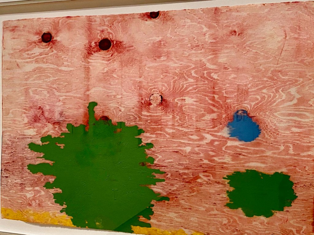 Later experiments show off Frankenthaler’s experimentation with woodcuts and monoprints. Here, she inked a woodblock and ran it multiple times to produce a “ghost print” of the wood, then applied bright red over the wood knots and added bright blobs of floating colors atop the natural backdrop.