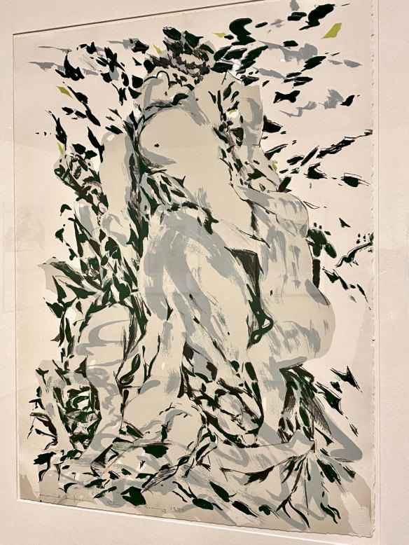 The curators also showcase Elaine’s multiverse interpretation of a famous Parisian sculpture in the Jardin de Luxembourg. The series mounted across the long wall gives gallery goers a close-up look at the intricate collaboration between Tamarind’s workshop masters and a midcentury mark maker.