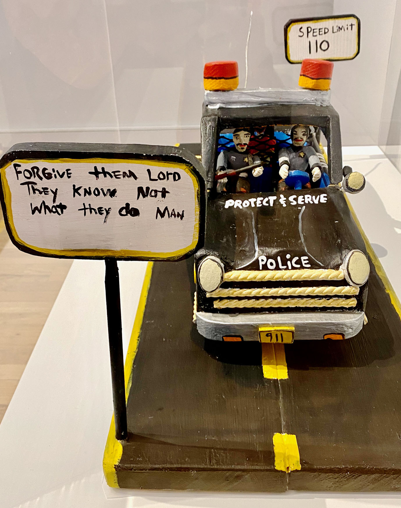 Herrera’s 1994 painted wood and mixed-media sculpture Protect and Serve with Jesus in the back seat of the patrol car. Courtesy: Smithsonian American Art Museum