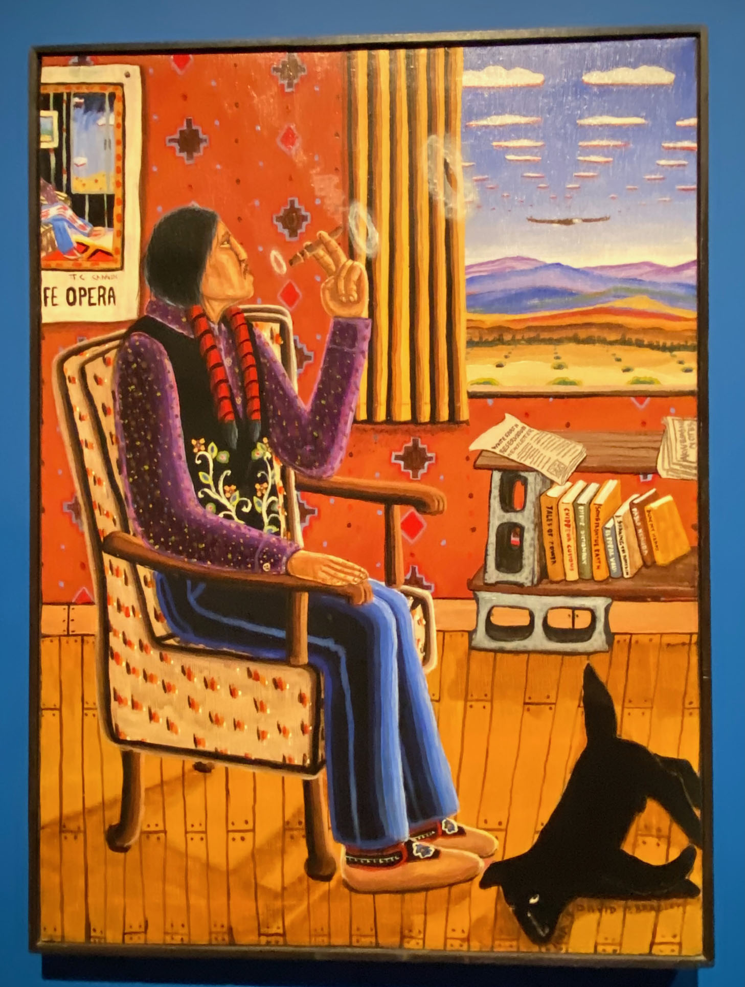 The “salon wall” is peppered with paintings that tell the interconnected histories and styles of nine Native artists – the trajectory from flat-style styles of the 1920s and 1930s to more open innovation of Ben Harjo and Linda Lomahaftewa, some of earliest graduates at the Institute of American Insitute Arts (IAIA).