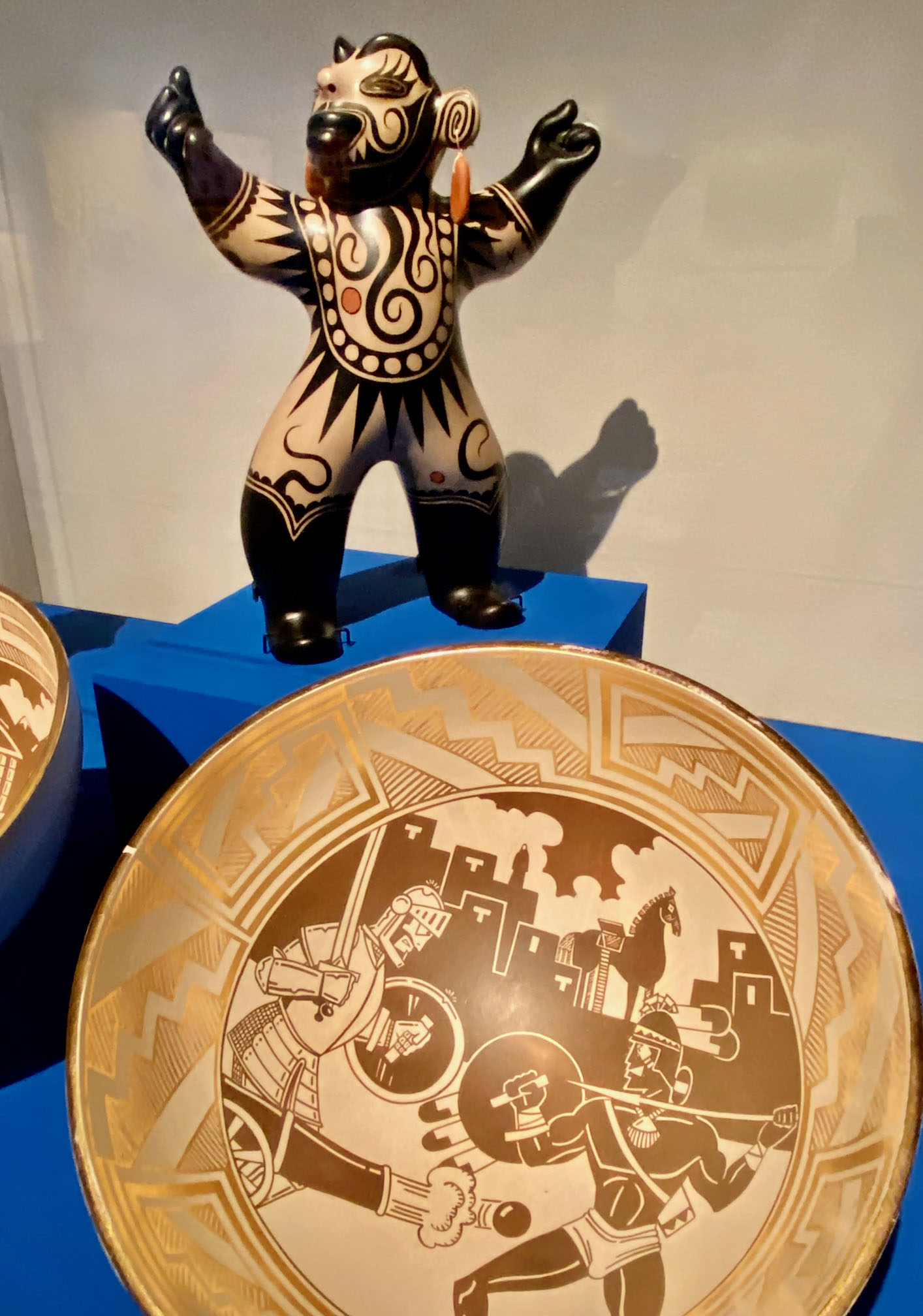 Virgil Ortiz’s (Cochiti) 2005 ceramic sculpture Monos Figure with Diego Romero’s (Chochiti) 2005 bowl Tenga Cuidado Con Griegos Salvo Obseqios.