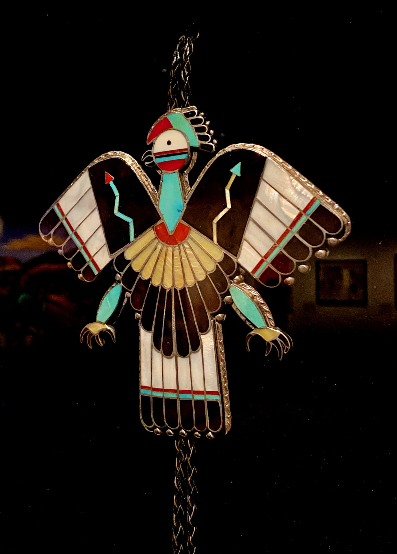 1970s-1980s thunderbird bolo by Owen Bobelu (Zuni); inlaid silver, jet, turquoise, and mother-of-pearl.