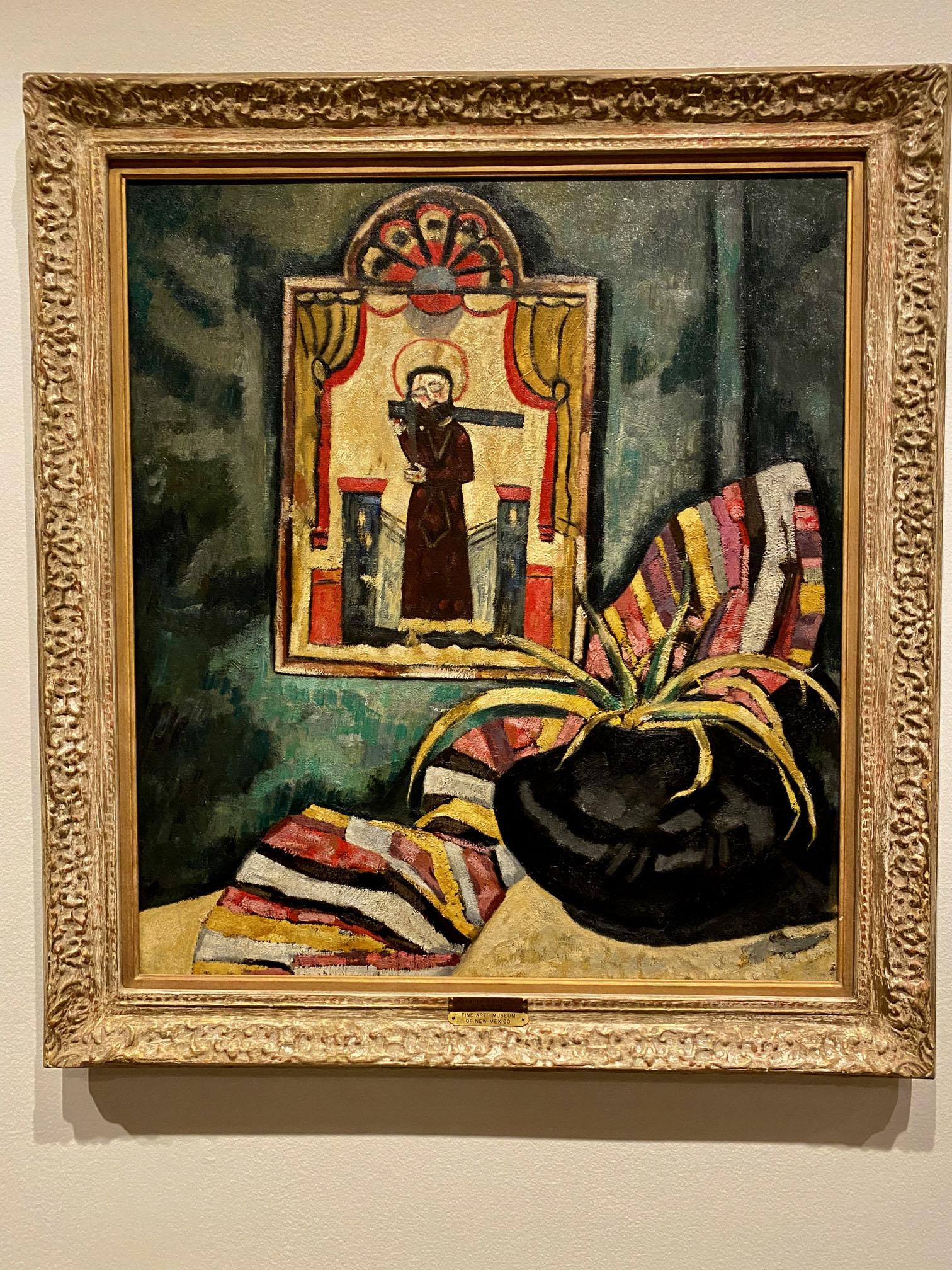 1918 in Taos and Santa Fe, where he traversed the hills, attended Pueblo ceremonies, and wrote about the indigenous culture. He also completed his El Santostill life with a black-on-black ceramic vase, a striped textile, and a Northern New Mexican retablo of a suffering Jesus.