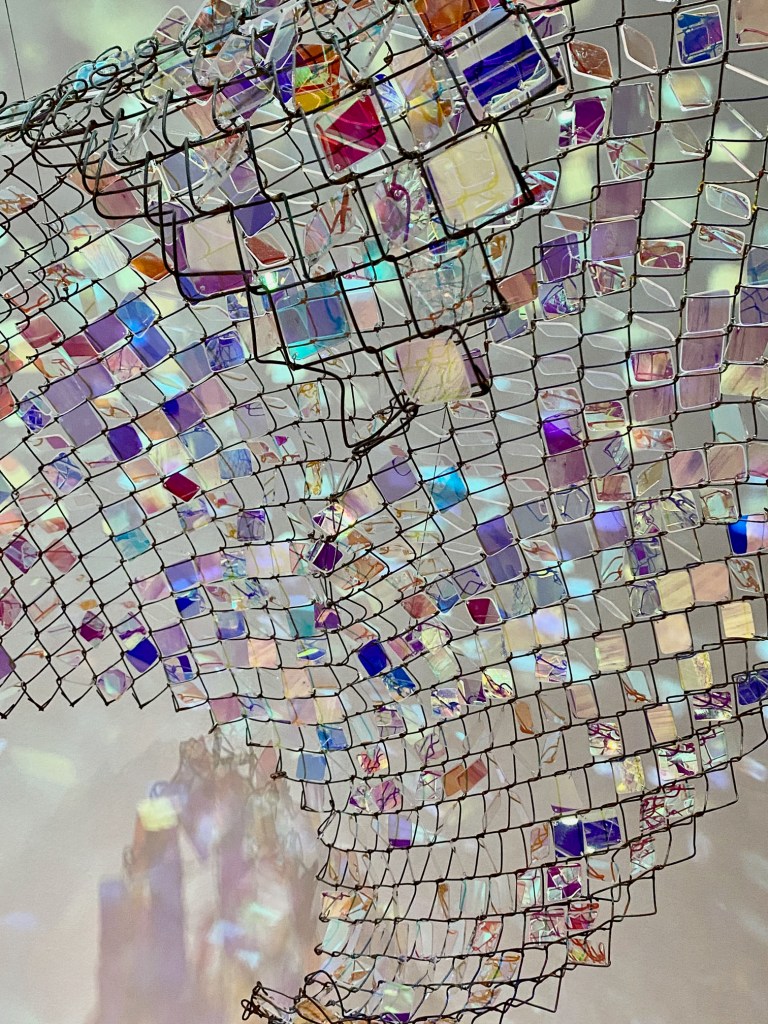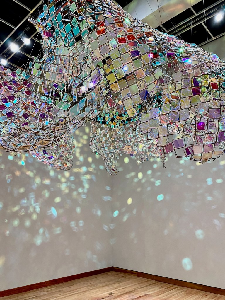 Nearby, there’s a comfortable lounge where you can watch Cosmologyscape, an interactive digital quilt – a public art project in which AI translates the public’s dreams into artist-created geometric symbols. It’s a collaboration with Alisha B. Wormsley, so the virtual community quilt manifests both African-American and Lakȟóta shapes.
