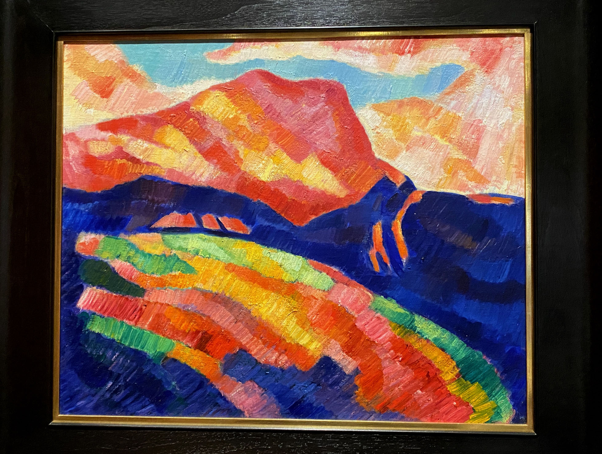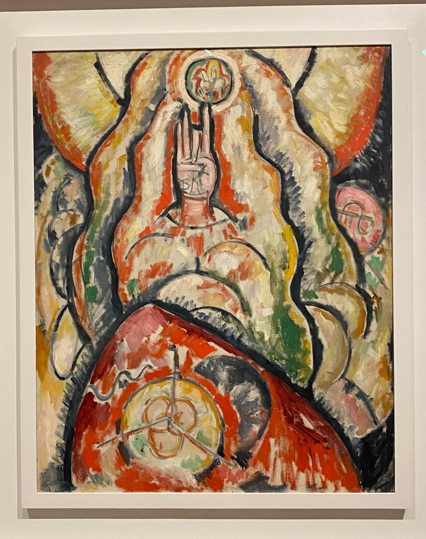 Getting to Europe in 1912, the color, cubism, and symbolism of the Blue Rider, Matisse, and Picasso made his head spin. His German friends introduced him to Kandinsky’s book Concerning the Spiritual in Art. He went out of his way to meet the man himself, and his painterly wheels turned.