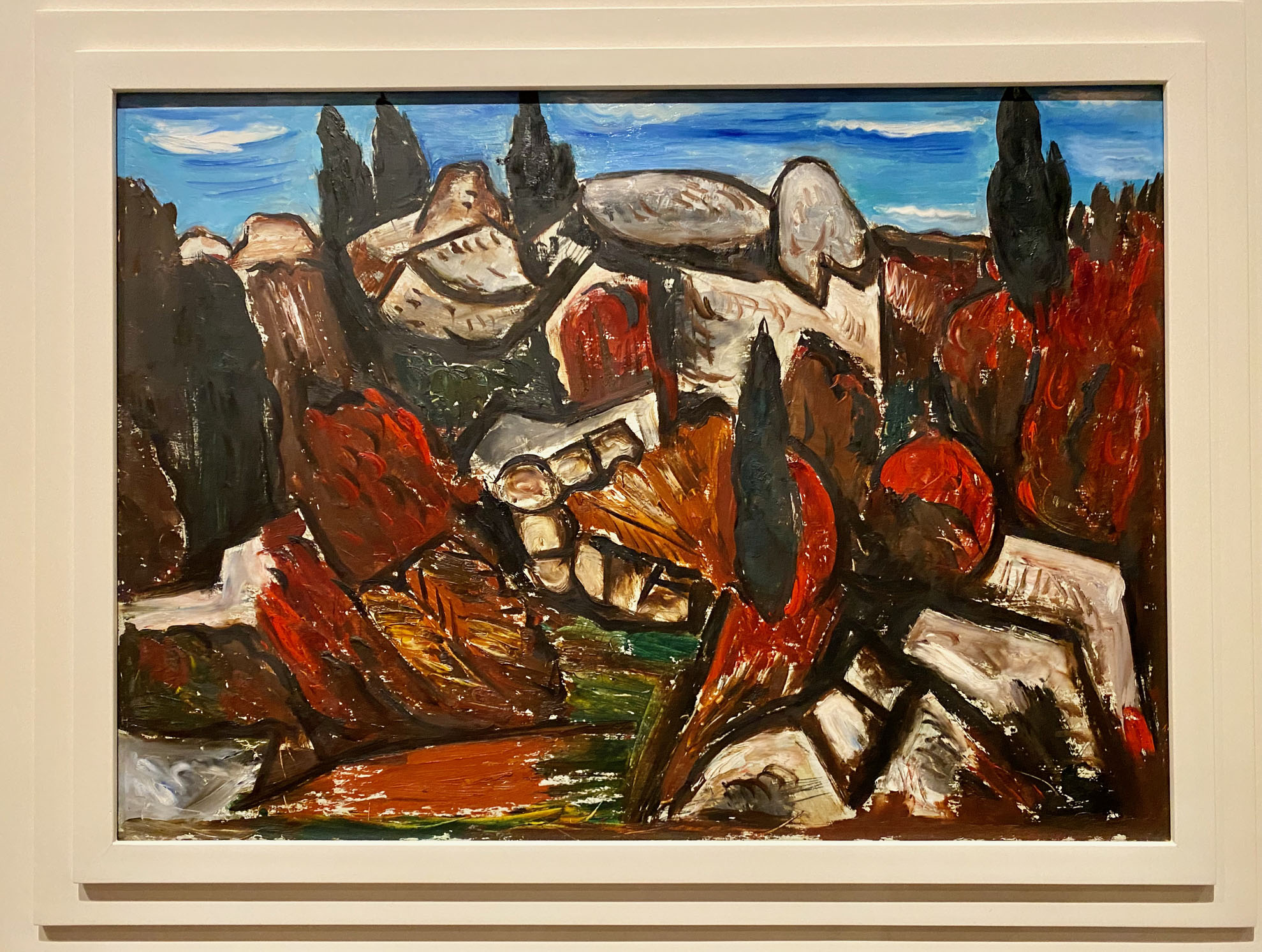 Near the Berlin abstractions are highly expressionist 1930s rockscapes from Maine and pointy Alpine peaks from his return to Bavaria. There’s an example of his stripped-down 1916 “synthetic cubist” work in Provincetown, a 1917 New England still life painted in Bermuda when he was budget-bunking with Demuth, and a red-saturated still life that is a therapeutic tribute to his Nova Scotia friends who died at sea in the late Thirties.