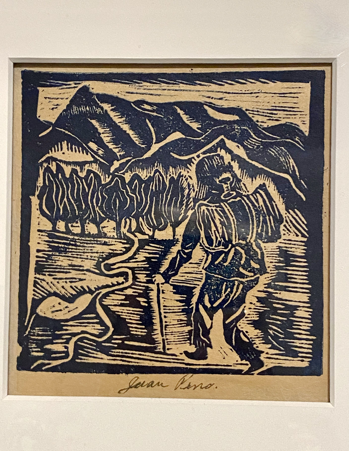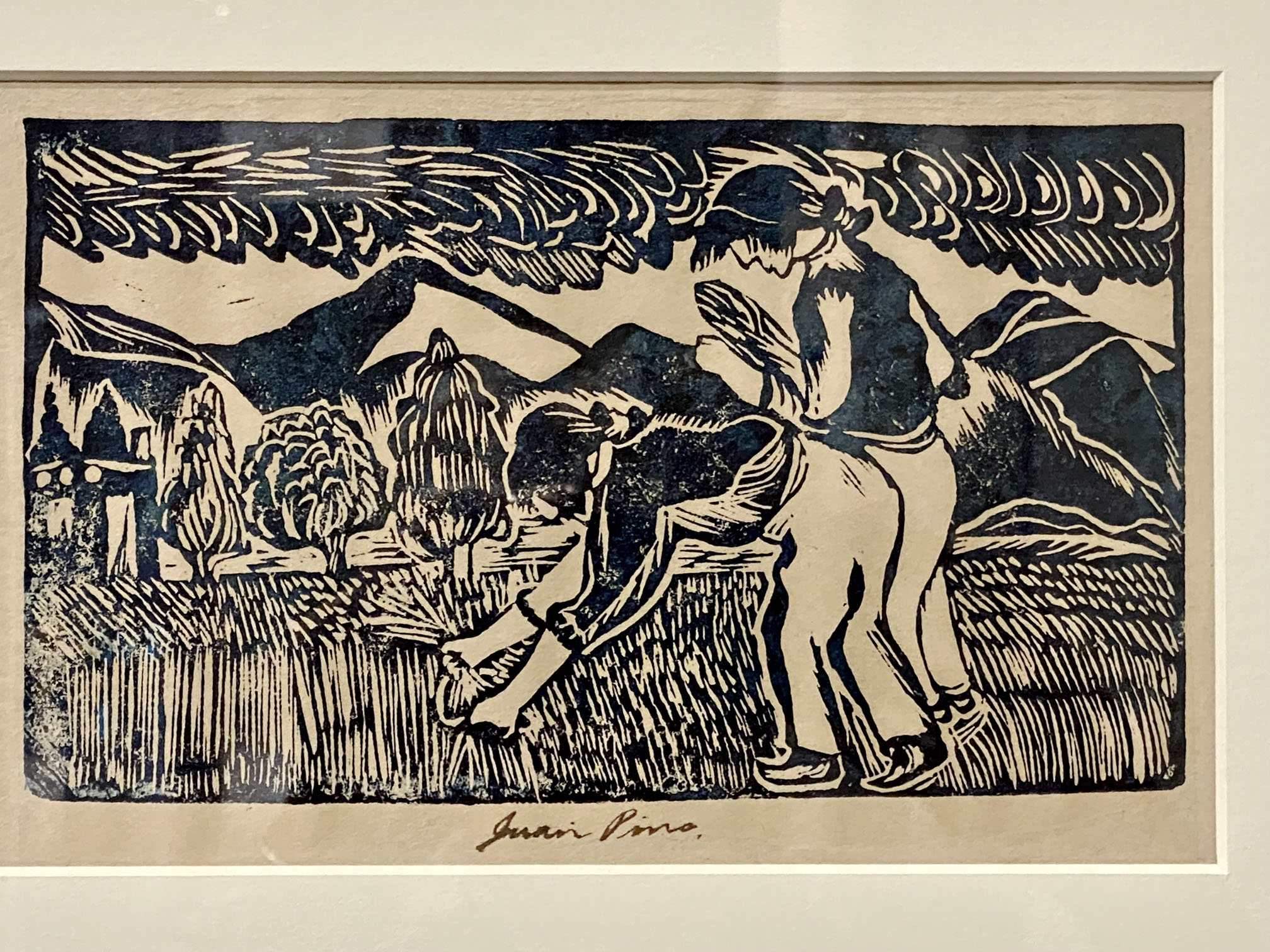 Juan Pino’s 1925 linocut print of two men harvesting wheat