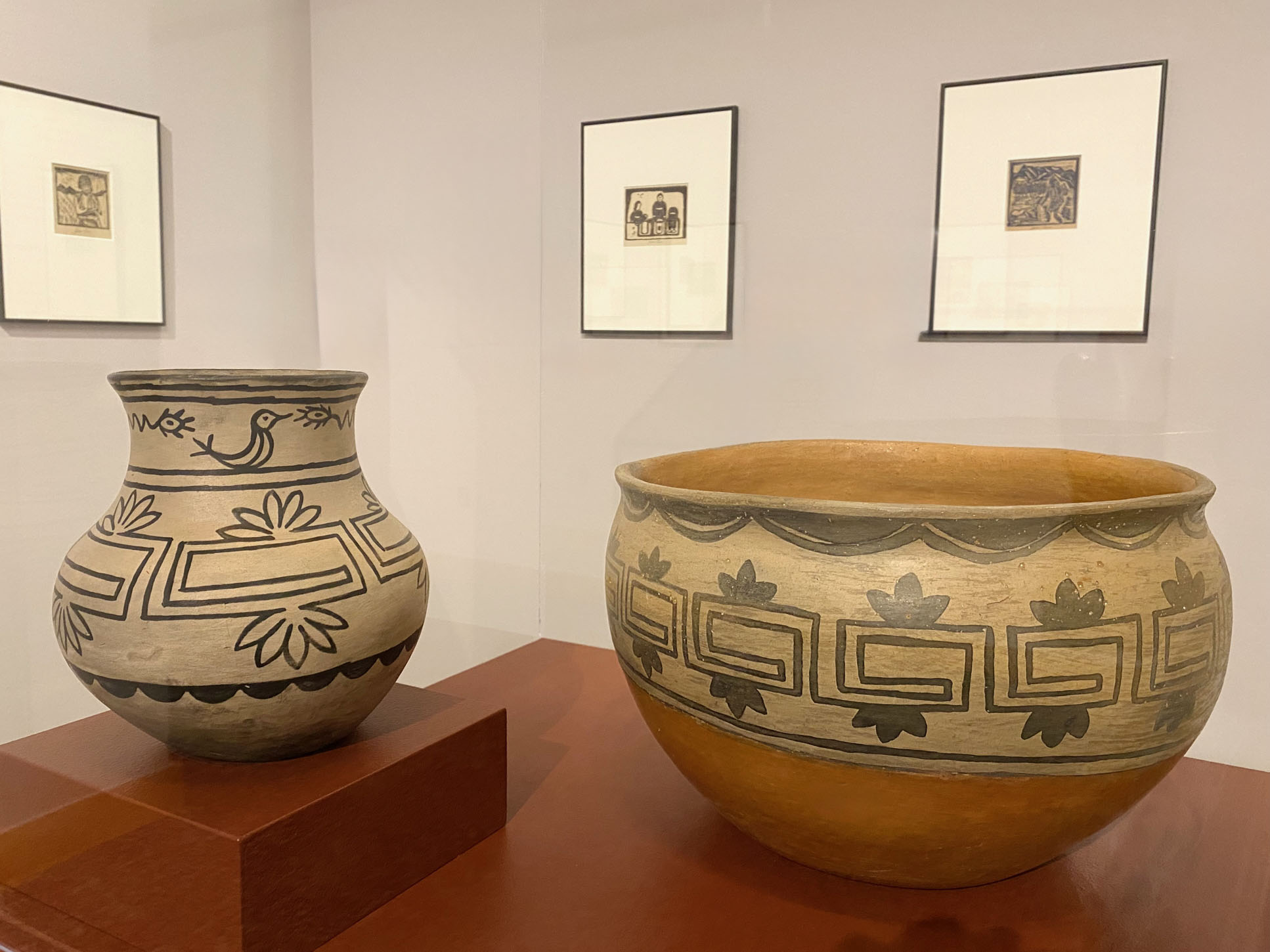 The show also has a beautiful touch that emphasizies Juan’s continuing artistic output: two large ceramic pieces from the Thirties and Forties created by his wife, Lorencita Pino. It’s likely Juan used his steady hand to apply strong, black lines – skills so evident in his masterful design for his slice-of-life print series.
