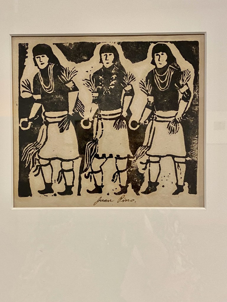 Juan Pino’s 1925 linocut print of three corn dancers – depicting himself, Vecillio Herrera, and Candido Herrera.