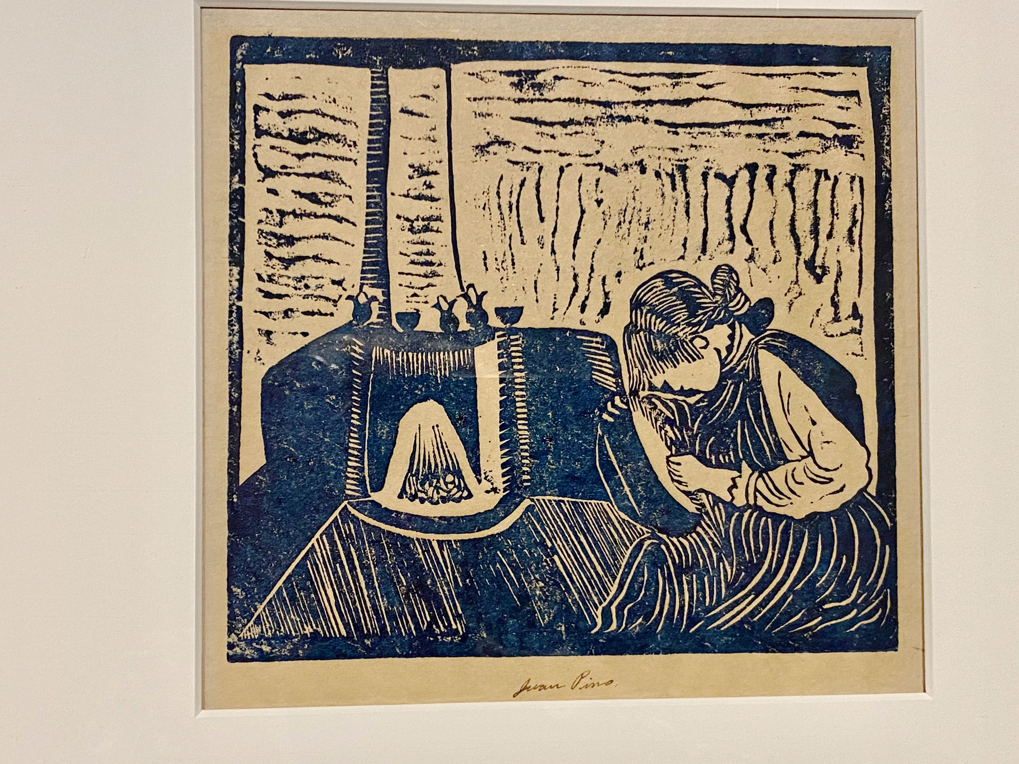 1925 linocut print of woman making pottery near fireplace…is it Lorencita?