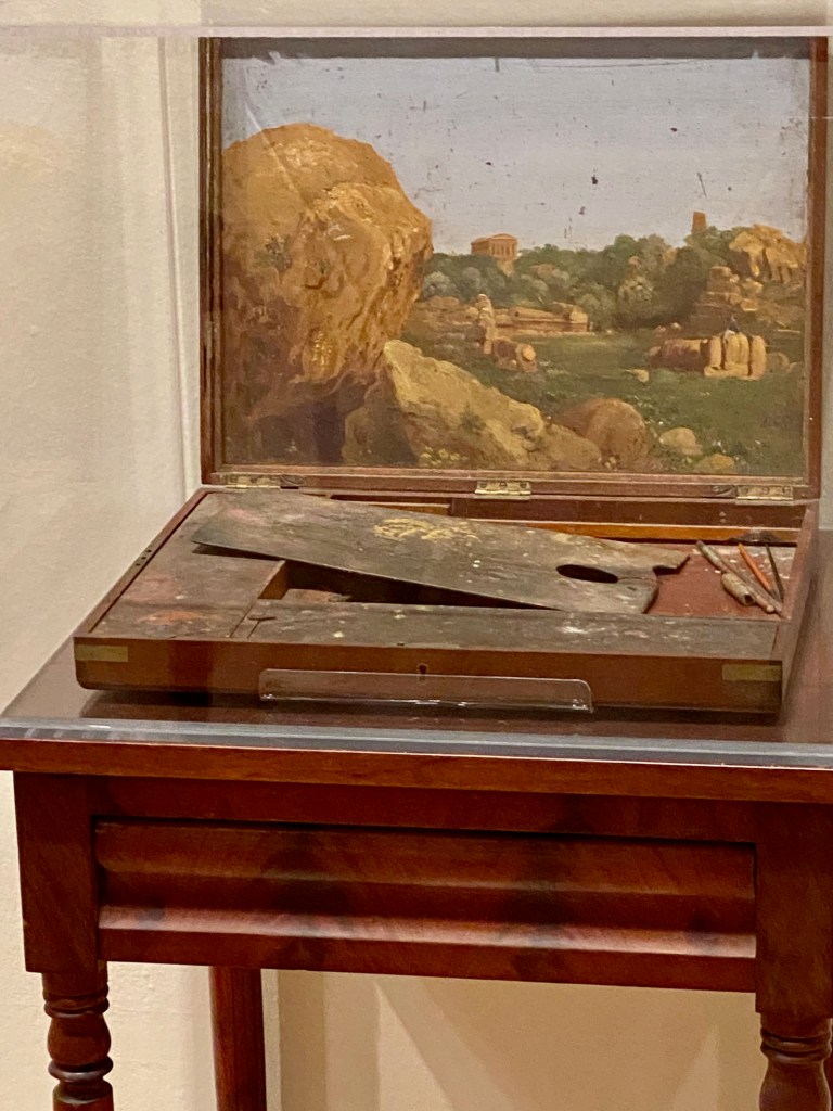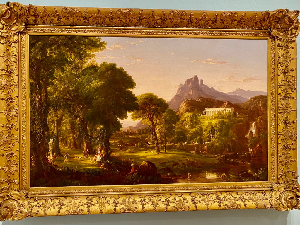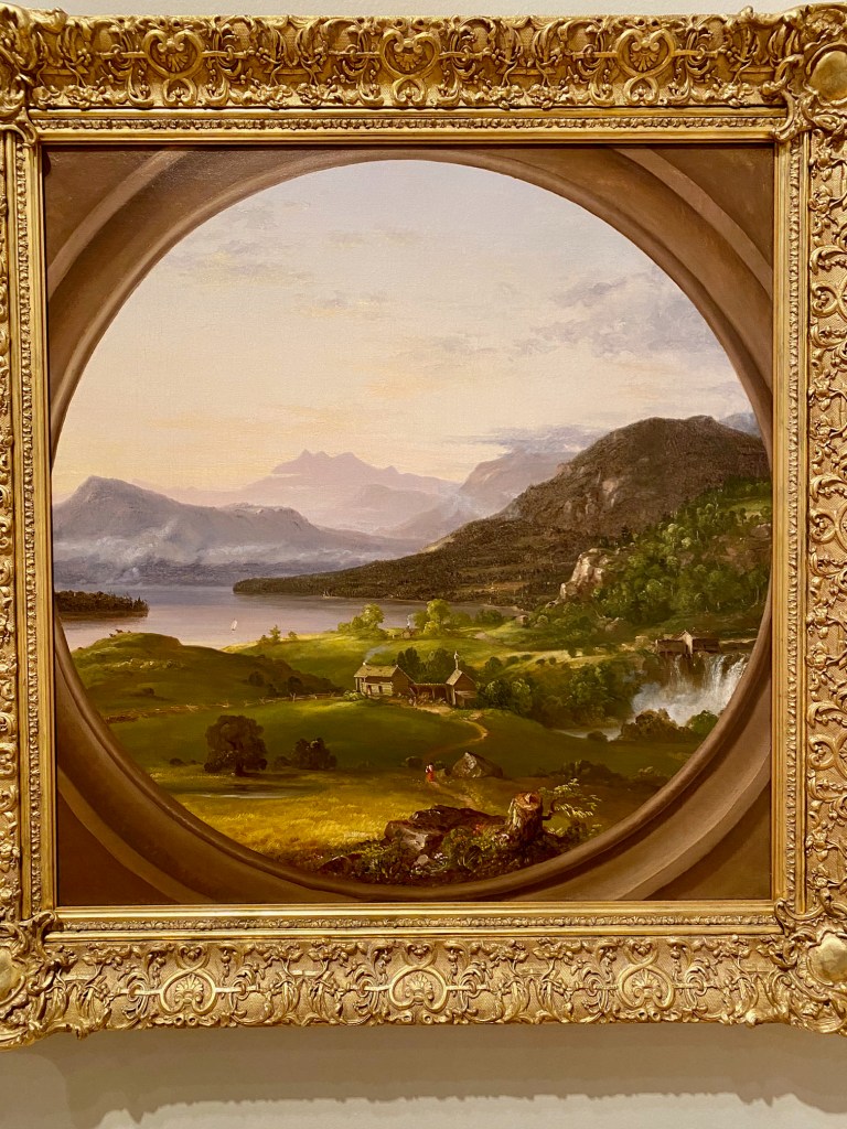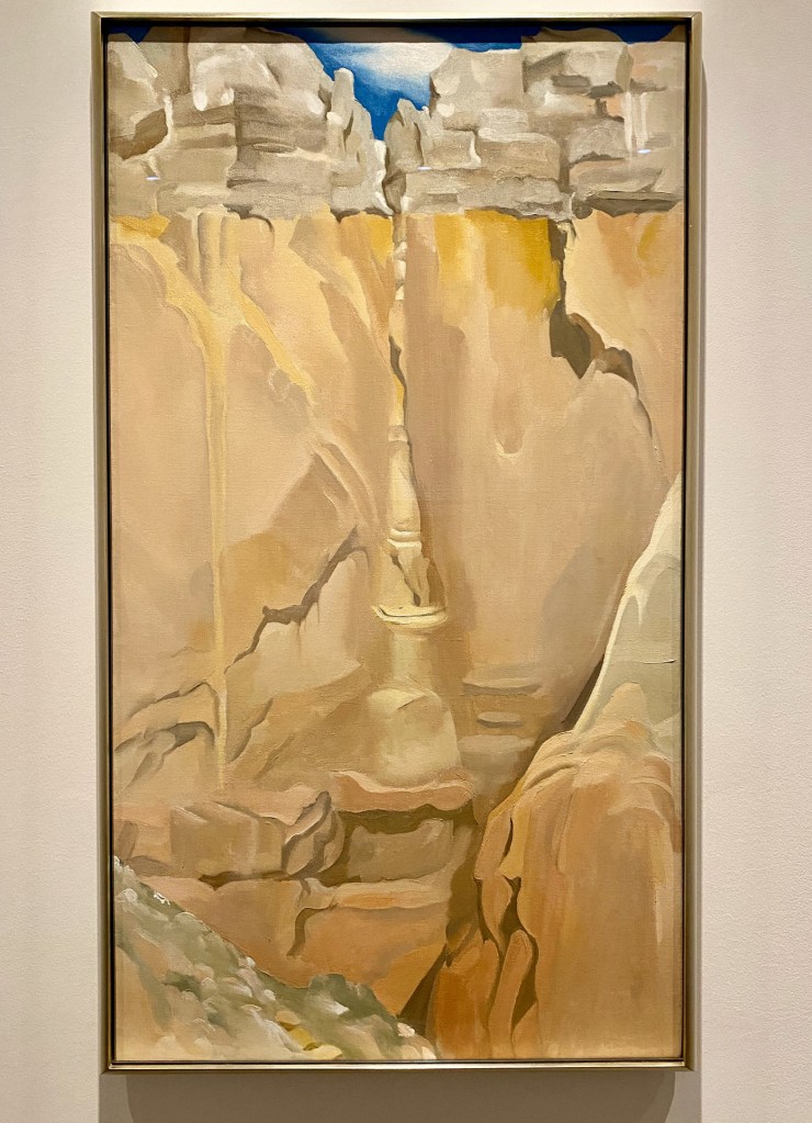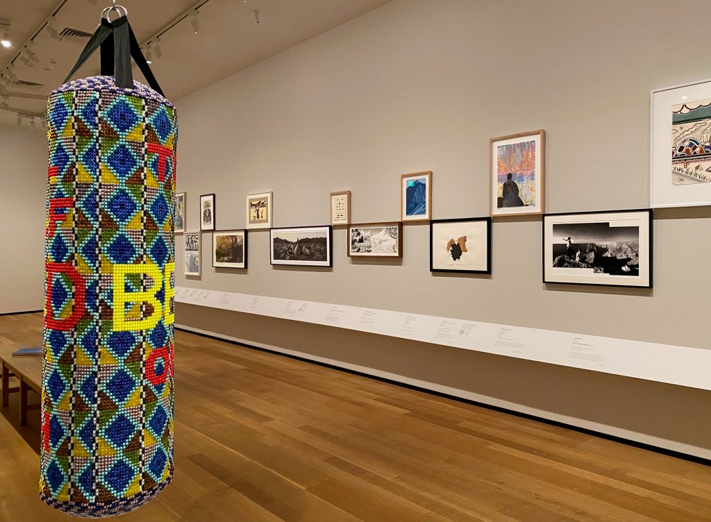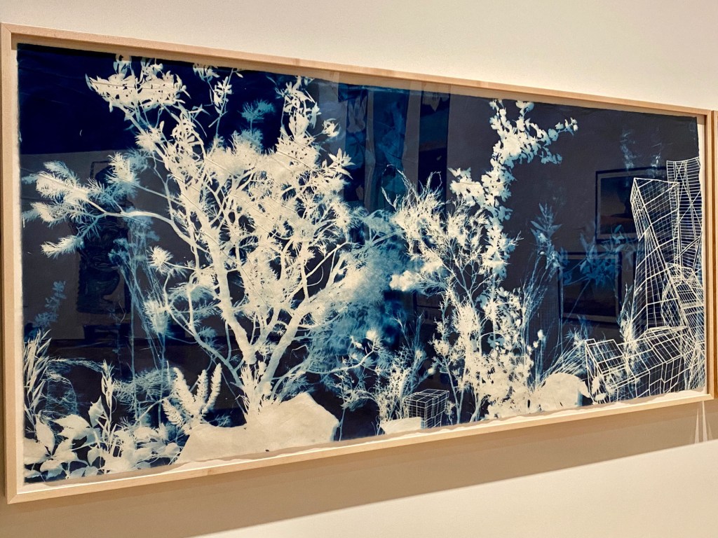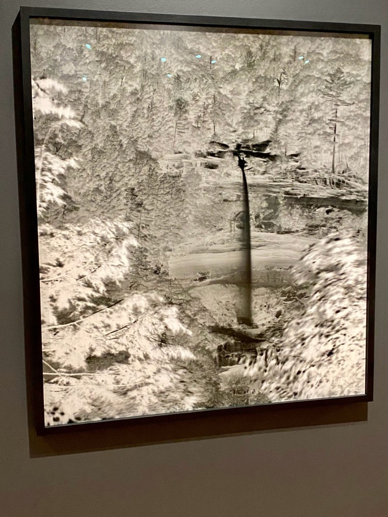 In the first gallery, Fernández selected a Smithson “nonsite” work – a minimalist series of boxes, each packed with rocks from the decidedly unromantic site of Franklin, New Jersey. Smithson’s “nonsite” includes a framed aerial photo that appears to document the site, but it’s a “readjusted” depiction of it. Not what it seems.