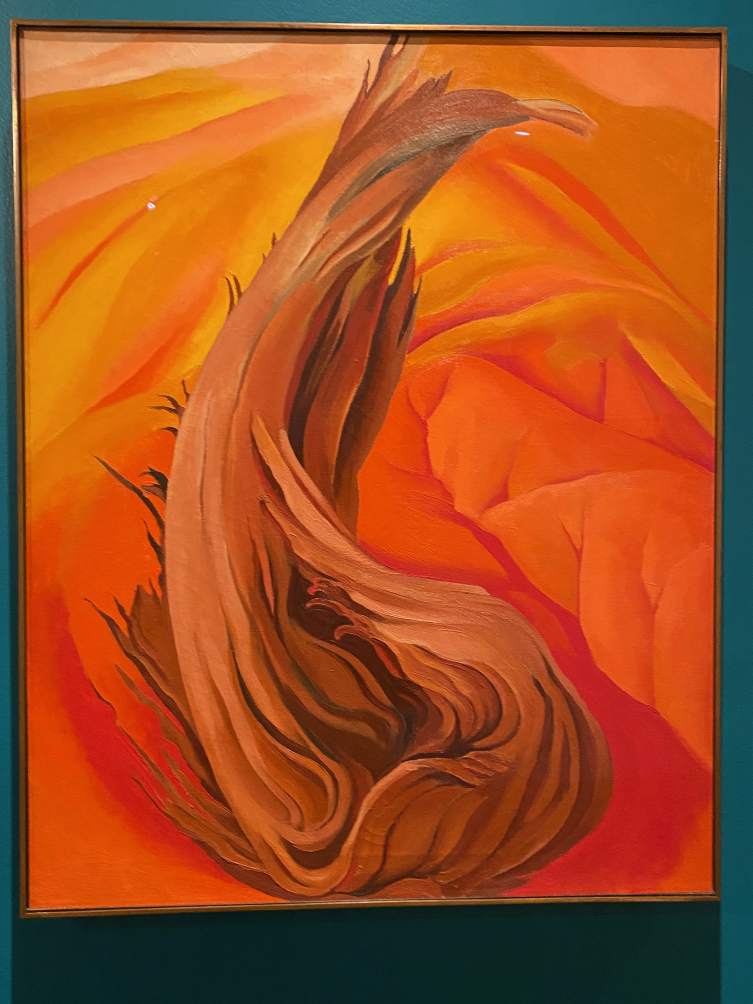 Both artists use reflection in their works. Manigual (Mirror) by Fernández– a tropical forest created from charcoal and sand – is affixed to a reflective surface, so you can “see yourself” in the charred thicket when you get right up to it. Smithson designed his earth-and-mirror Red Sandstone Corner Piece so that every gallery goer’s image is part of the visual experience – from close up, far back, and far away. You’re linked to the red sandstone.
