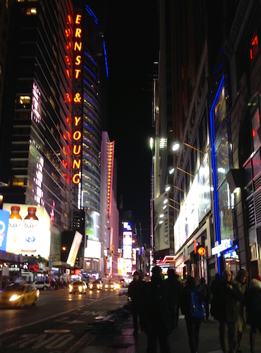 Insiders at the Skyscraper Museum’s winter program at Columbia University let us in on the fact that the there are actually design requirements for flashing signs and billboards in Times Square to be at off-angles and tilts to maintain the slapped-together look of the area – design elements flouted by Vornado’s new block-long HD video billboard.