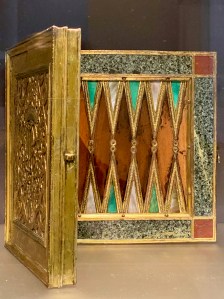 Golden mosaics, golden halos, golden chasubles, embellished holy portaits, golden uniforms, and golden coin containers from Italy, Mexico, Peru, China, and Japan line the next galleries, demonstrating how different cultures have integrated gold into private and public devotions, court, and the economy. In Italy, for example, one era’s minted golden coins are transformed into another era’s golden halos for saints in home altars.