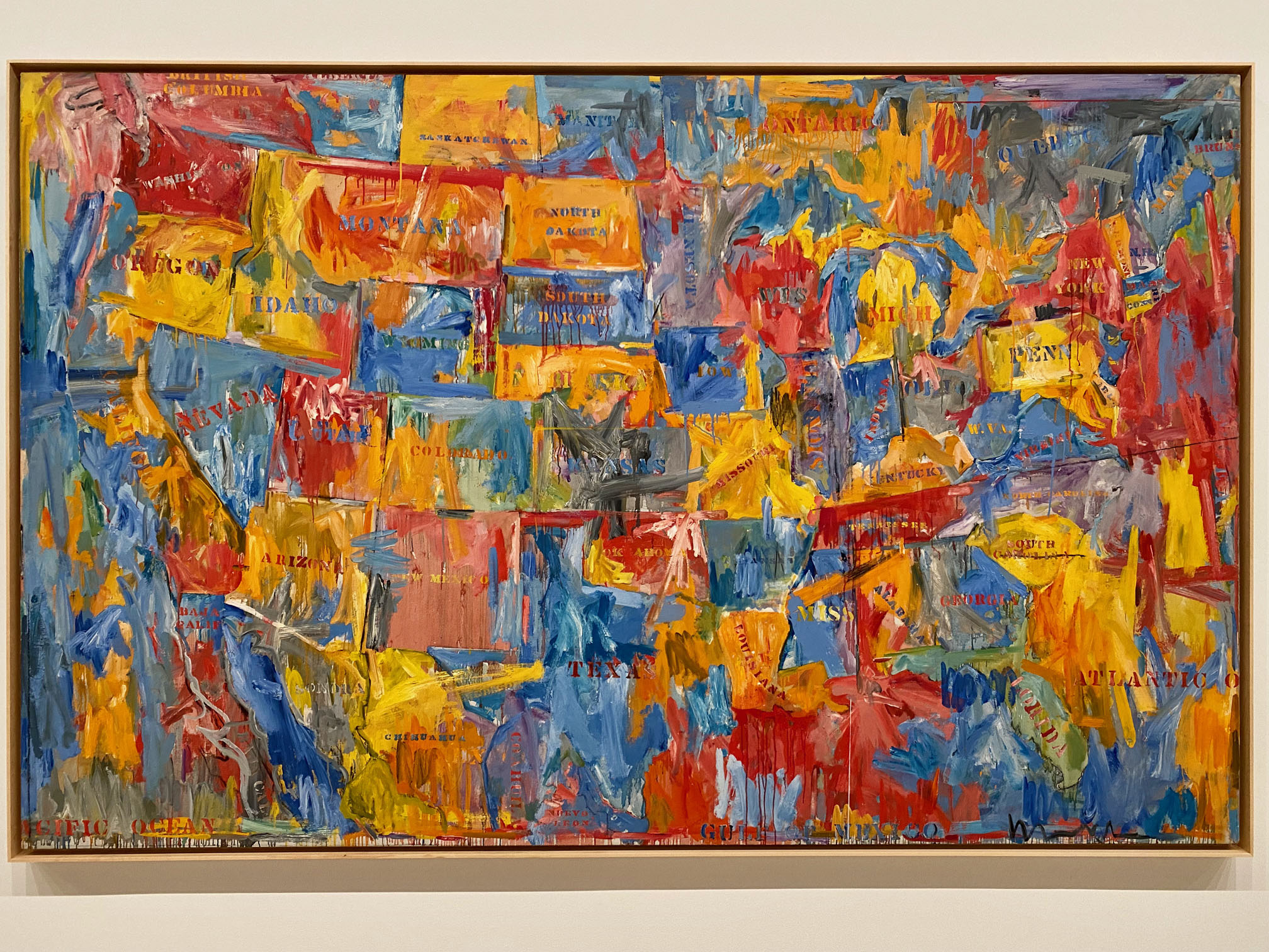 It’s joyful to poke through the first few galleries and experience Johns’ early experimentations with stenciled lettering, disappearing letters, collaged newsprint, and maps enlivened by painterly gestures and swipes.